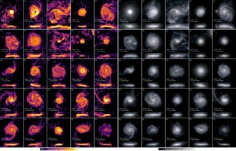 Rappresentazione di venticinque galassie a disco. A sinistra, il filtro colorato evidenzia la luce emessa nella linea H-alpha dal gas interstellare, e indica la formazione stellare in corso. A destra, il filtro seleziona la luce ottica emessa dalle stelle giovani (più blu) e vecchie (più rosse). Crediti: IllustrisTng collaboration