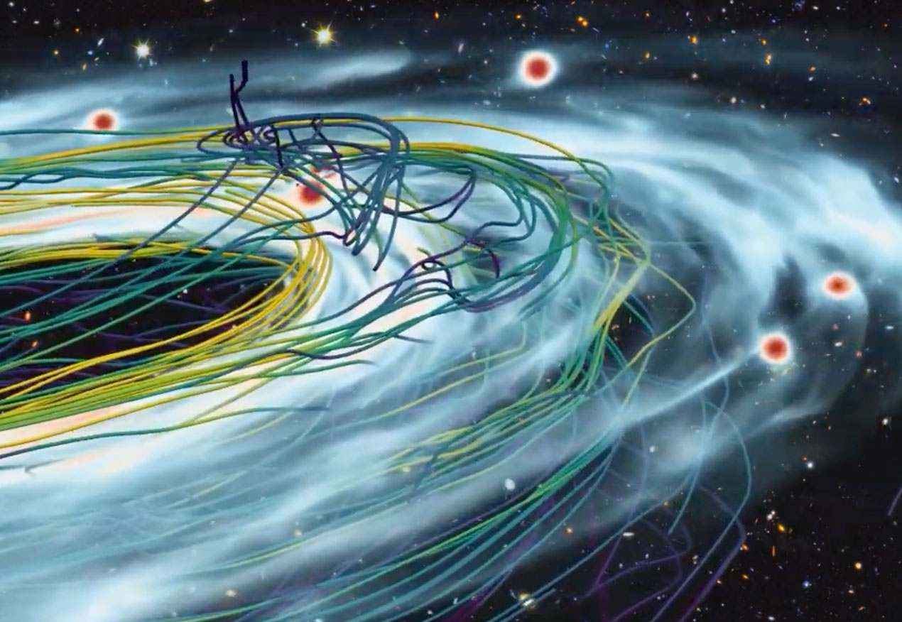 Rappresentazione artistica delle linee di campo magnetico lungo il disco protoplanetario di un sistema in formazione. Crediti: Jean Favre Cscs