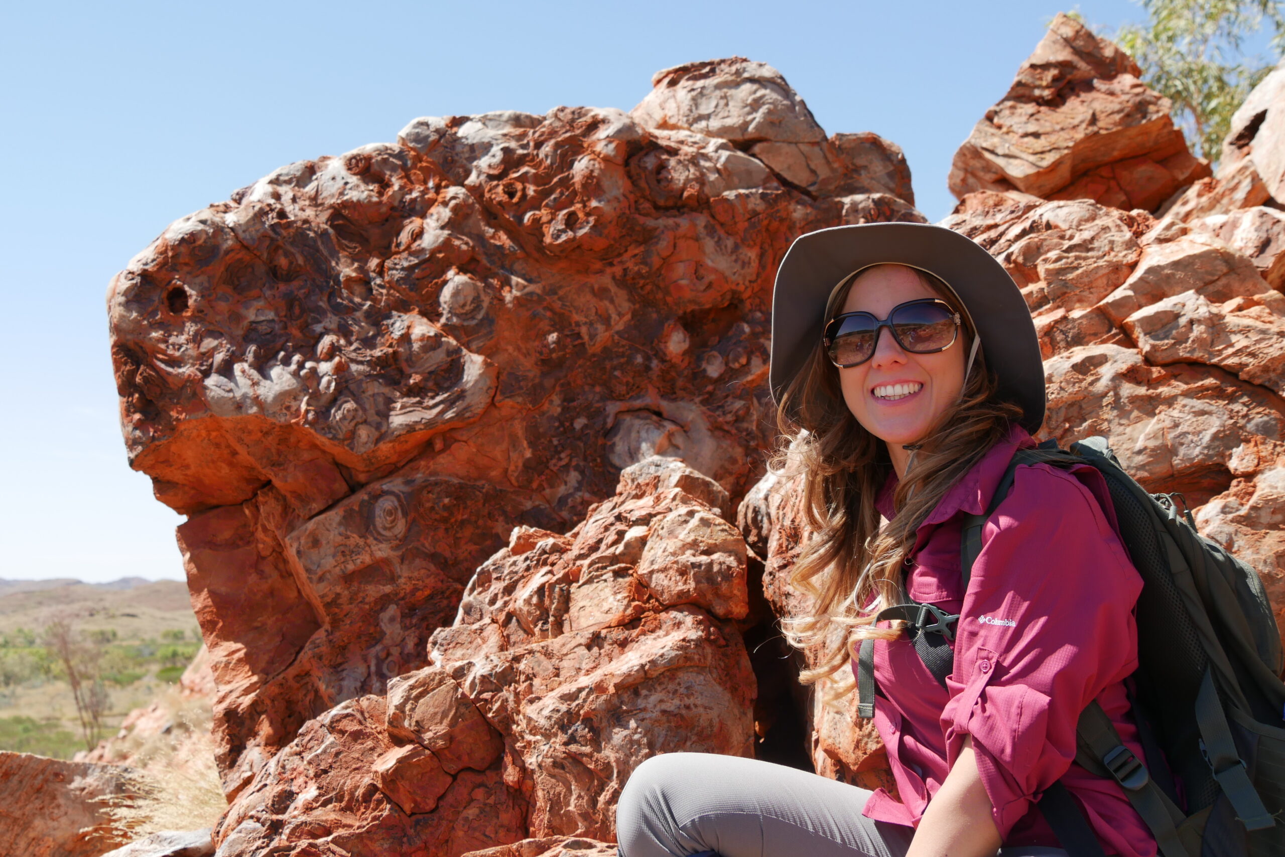 La ricercatrice Teresa Fornaro a Pilbara, Australia, un sito dalle condizioni estreme, considerato un analogo marziano. Qui, nell’agosto 2019, si sono riuniti gli scienziati delle missioni ExoMars e Mars 2020 per studiare biosignature morfologiche terrestri quali le stromatoliti di 3.48-2.72 miliardi di anni (visibili nella foto, dietro la ricercatrice) e discutere su come utilizzare gli strumenti a bordo dei due rover per rivelare simili biosignature eventualmente presenti su Marte. Crediti: T. Fornaro