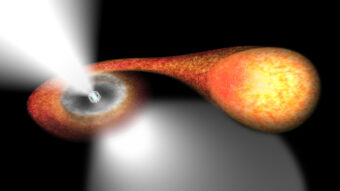 Durante la fase esplosiva, la luminosità di Sax J1808.4-3658 – a oggi si conoscono una ventina di sistemi simili ad essa – aumenta significativamente sia in banda ottica e ultravioletta (Uv) che nei raggi X, e inizia l’accrescimento: l’altra stella trasferisce materia e momento angolare alla pulsar attraverso un disco che si estende fino a pochi chilometri dalla sua superficie. Questo processo accelera la rotazione della pulsar e convoglia la materia in accrescimento sui suoi poli, dando origine a un segnale pulsato nei raggi X.