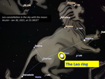 L’anello del Leone evidenziato su una mappa del cielo prodotta con Stellarium. La dimensione angolare è pari a circa tre volte quella della Luna piena, che per pura combinazione qualche settimana fa – il 30 gennaio 2021 – si trovava proprio al centro dell’anello, così come rappresentato nella mappa. Crediti: E. Corbelli/Inaf; Stellarium