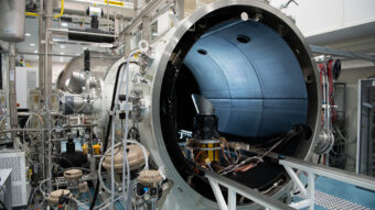 Un modello della fotocamera di Plato all’interno della Thermal Vacuum Chamber, la camera termica a vuoto nella quale è stato sottoposto ai test termo-meccanici. Crediti: Esa – Matteo Apolloni