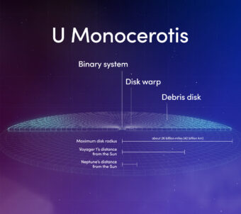 Per studiare il disco i ricercatori hanno utilizzato i dati di Sma (Submillimeter Array), un insieme di otto radiotelescopi di sei metri ciascuno situato sul Maunakea, alle Hawaii: il disco di U Monocerotis ha un diametro di 82 miliardi di chilometri e le stelle binarie orbitano in un buco al suo interno (vedi immagine d’apertura). Come Rv Tauri, anche U Monocerotis varia la sua luminosità a causa dell’interazione con il disco di polveri e dell’espansione e contrazione degli strati di plasma stellare.