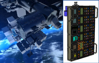 A sinistra, la piattaforma Bartolomeo. A destra, la facility Euro Material Ageing, dove saranno ospitati i cristalli nel corso della loro permanenza in orbita bassa. Crediti: Airbus, Esa