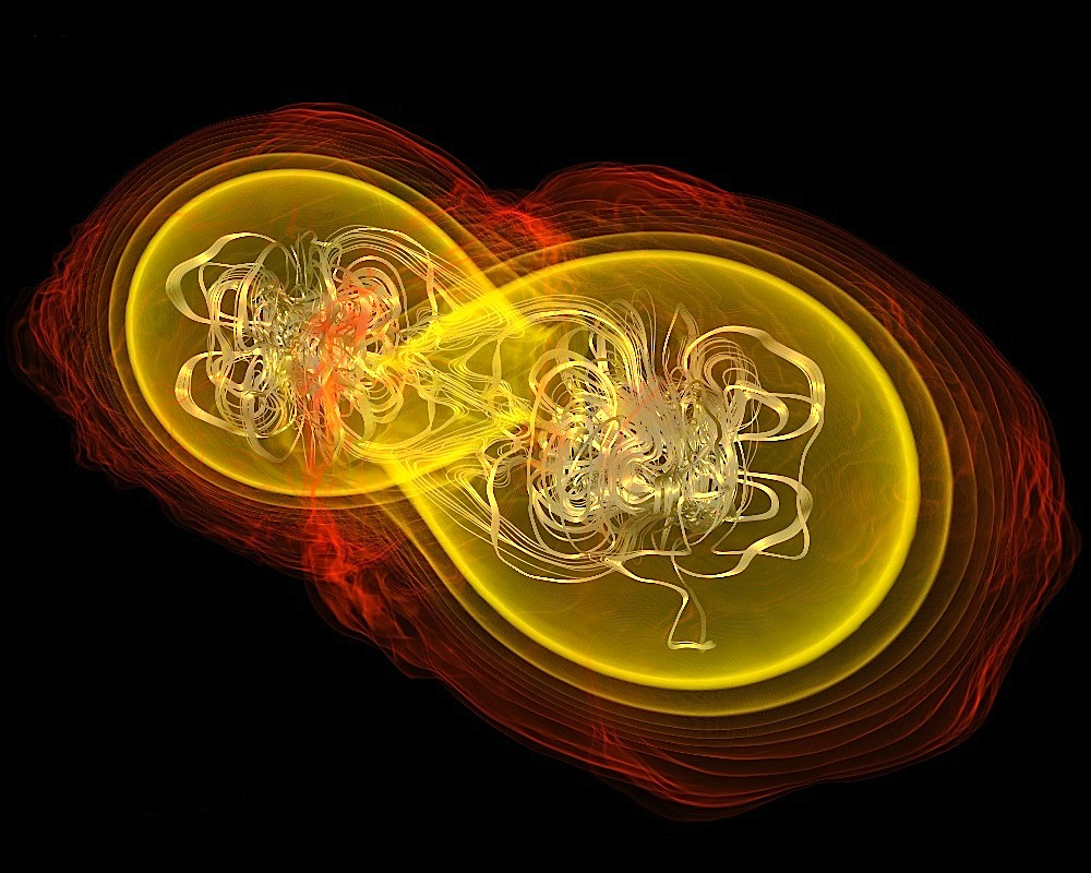 Immagine prodotta a partire da una simulazione della fusione di due stelle di neutroni. Osservazioni di collisioni come queste possono aiutarci a determinare la massa massima che una stella di neutroni può raggiungere. Crediti: Nasa / Aei / Zib / M. Koppitz e L. Rezzolla