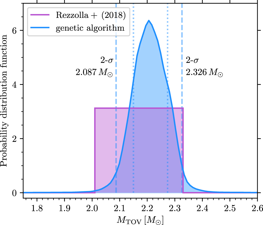 Funzione di distribuzione di probabilità per la massa massima di una stella di neutroni non rotante, come stimato dall’algoritmo genetico degli autori (curva blu) e in un precedente studio di Gw170817 (curva viola). Crediti: Nathanail et al. 2021