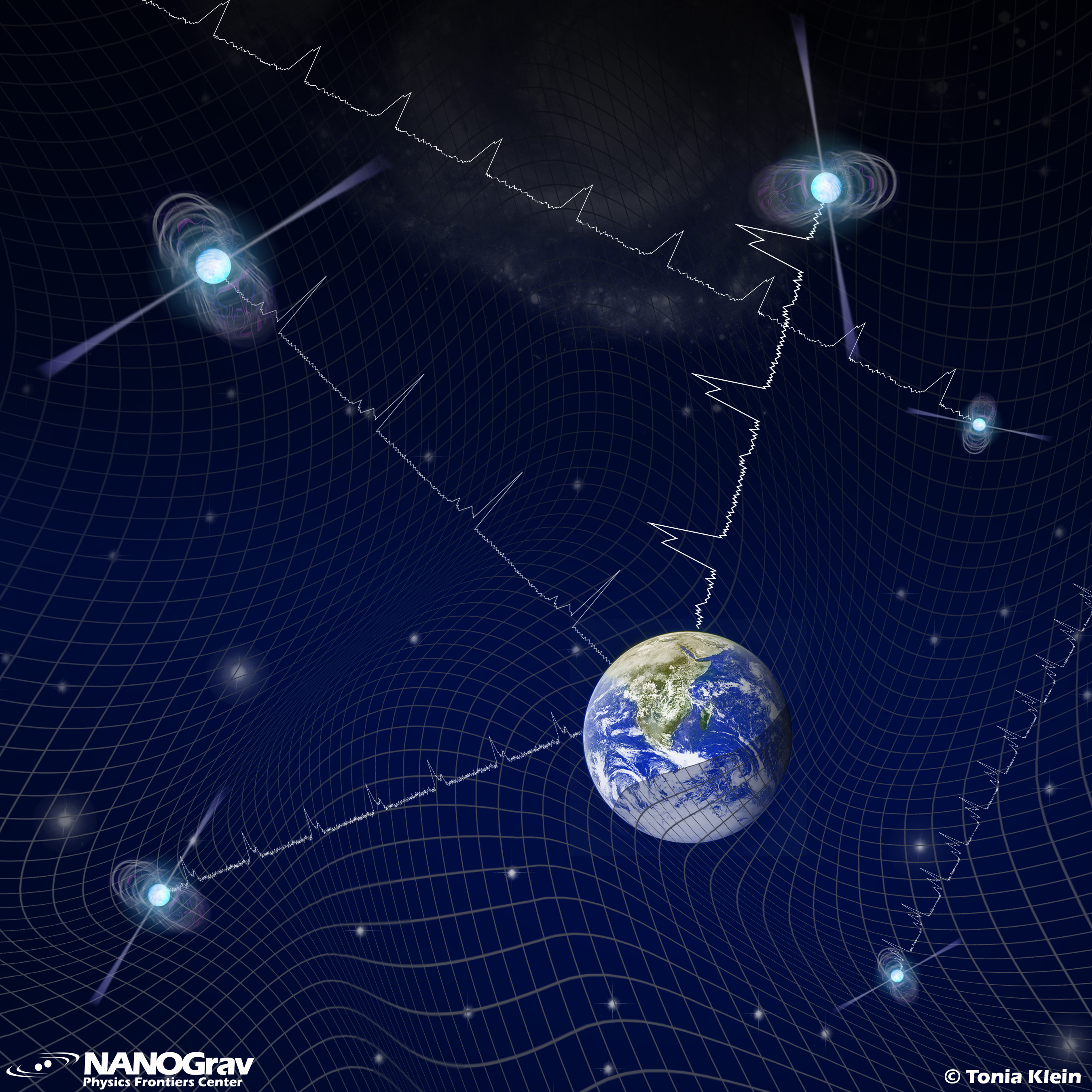 Illustrazione rappresentativa della Terra nello spazio-tempo deformato dal fondo di onde gravitazionali e gli effetti della deformazione sui segnali radio provenienti dalle pulsar osservate. Crediti: NanoGrav / T. Klein