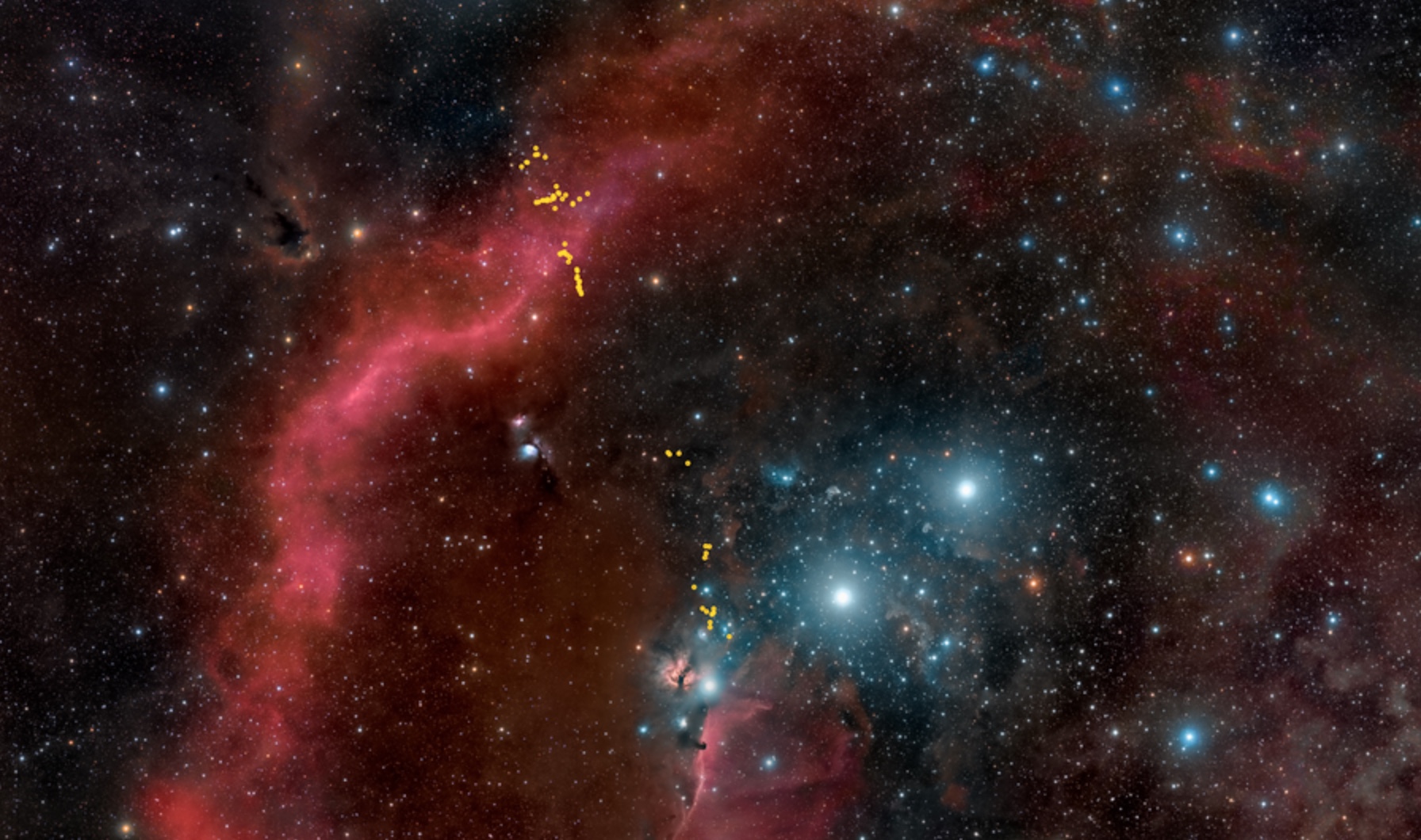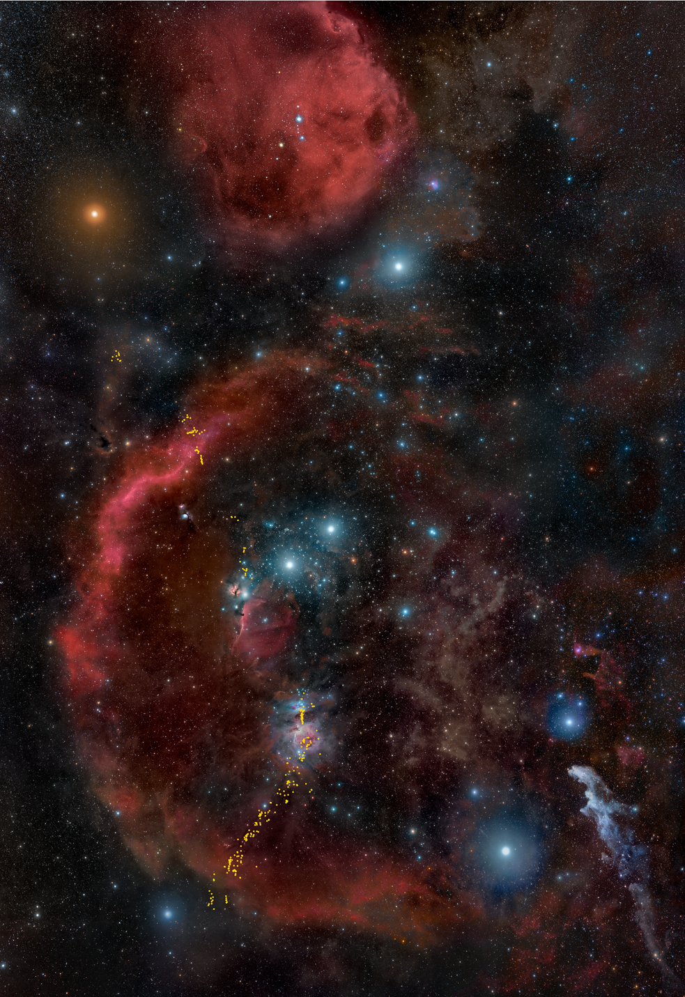 Ampia visuale dell’intero complesso di Orione, la fabbrica di stelle più vicina alla Terra che si conosca. I ricercatori hanno utilizzato i telescopi spaziali Hubble e Spitzer della Nasa e Herschel dell’Esa per analizzare come i potenti getti bipolari delle giovani stelle scolpiscano le cavità nelle vaste nubi di gas. I puntini gialli (cliccare per ingrandire) indicano le 304 protostelle oggetto dello studio. Crediti: R. B. Andreo, DeepSkyColors.com; Nasa, Esa, STScI, N. Habel e S. T. Megeath (University of Toledo).