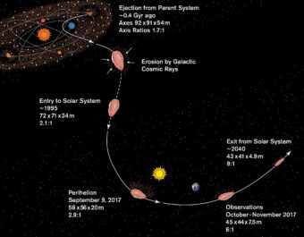 Fin dall’inizio non è stato del tutto chiaro di che tipo di oggetto si trattasse. ‘Oumuamua ha infatti alcune caratteristiche simili alle comete e altre simili agli asteroidi: per esempio non ha una chioma, ma durante il perielio ha ricevuto un’accelerazione non-gravitazionale come quella che ottengono le comete quando espellono gas dalla loro superficie. Nonostante inizialmente si sia stimata una forma allungata a sigaro, successive analisi hanno mostrato come ‘Oumuamua sia più che altro un tozzo pancake rotolante. Probabilmente non doveva essere così piatto quando è entrato nel Sistema solare: per ottenere la spinta osservata, l’oggetto interstellare deve aver perso fino al 95 per cento della sua massa durante l’incontro ravvicinato con il Sole.