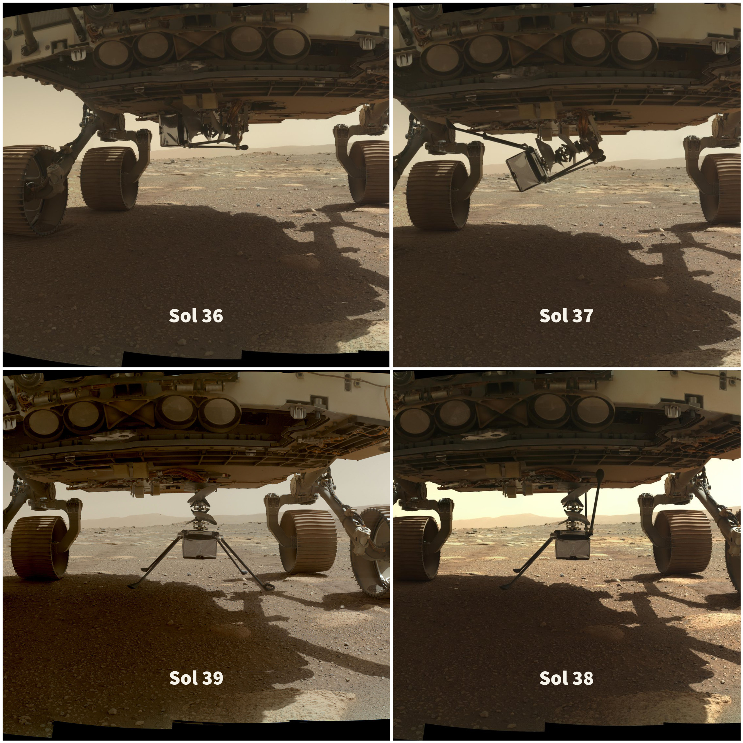 Le operazioni di dispiegamento di Ingenuity sono iniziate il 27 marzo scorso (il 36mo Sol della missione), con l’attivazione del cosiddetto bolt-breaking device, il meccanismo che ha permesso al controllo di missione di rimuovere il blocco che teneva l’elicottero saldamente ancorato contro la pancia di Perseverance. Le manovre sono poi proseguite con successo nei giorni seguenti, come da cronoprogramma. Il 28 marzo (Sol 37) è avvenuta l’attivazione del dispositivo tagliacavi, che ha consentito al braccio caricato a molla che tratteneva Ingenuity di iniziare a ruotare dalla sua posizione orizzontale e a due delle quattro zampe del drone di dispiegarsi. Il 29 marzo (Sol 38), grazie a un motore elettrico, Ingenuity è stato portato in posizione perfettamente verticale. E il 30 marzo (Sol 39), con il dispiegamento delle ultime due delle quattro zampe, ha raggiunto la sua configurazione finale per il decollo, distante soli dieci centimetri dal suolo marziano. Una posa che l’imager Watson – uno dei due occhi dello strumento Sherloc – ha catturato e che la Nasa ha scelto come immagine astronomica del giorno del 3 aprile 2021.