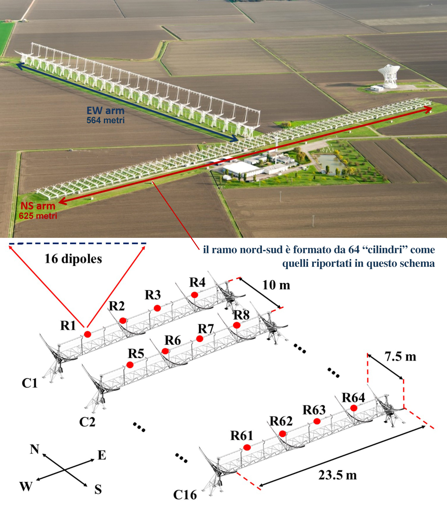 In alto, veduta aerea della Stazione di Medicina, con i due rami perpendicolari della Croce del Nord. In basso, schema dei “cilindri” che formano il ramo nord-sud. Fonte: N. Locatelli et al. Mnras, 2020