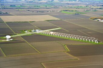 La stazione di Medicina, con i due rami perpendicolari della Croce del Nord al centro. Sulla sinistra, l’antenna parabolica da 32 metri. Crediti: G. Bianchi