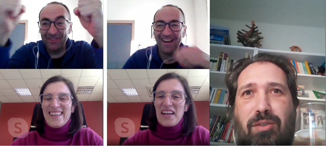 A sinistra: Germano Bianchi apprende da Maura Pilia della prima detection di un fast radio burst da parte della Croce del Nord. A destra: Bianchi, Pilia e Gianni Bernardi festeggiano il risultato su Skype.