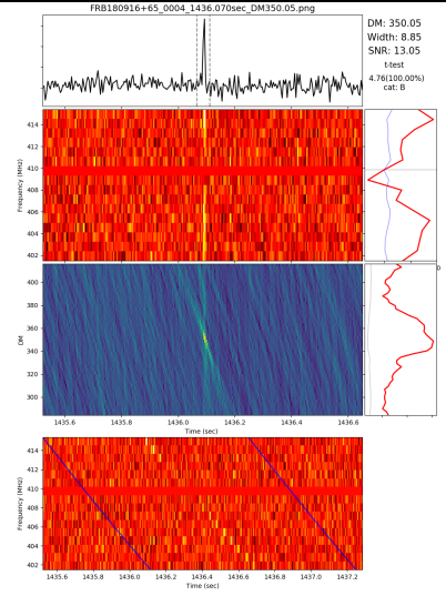 Il primo fast radio burst captato dalla Croce del Nord. Il pannello in alto mostra il profilo del segnale ricevuto. Nel secondo pannello, il segnale è stato corretto tenendo conto della dispersione nel mezzo interstellare; il terzo indica la significatività della misura di dispersione, e il quarto mostra la misura di dispersione, identificata dalle linee diagonali. Crediti: G. Bernardi et al (2021)