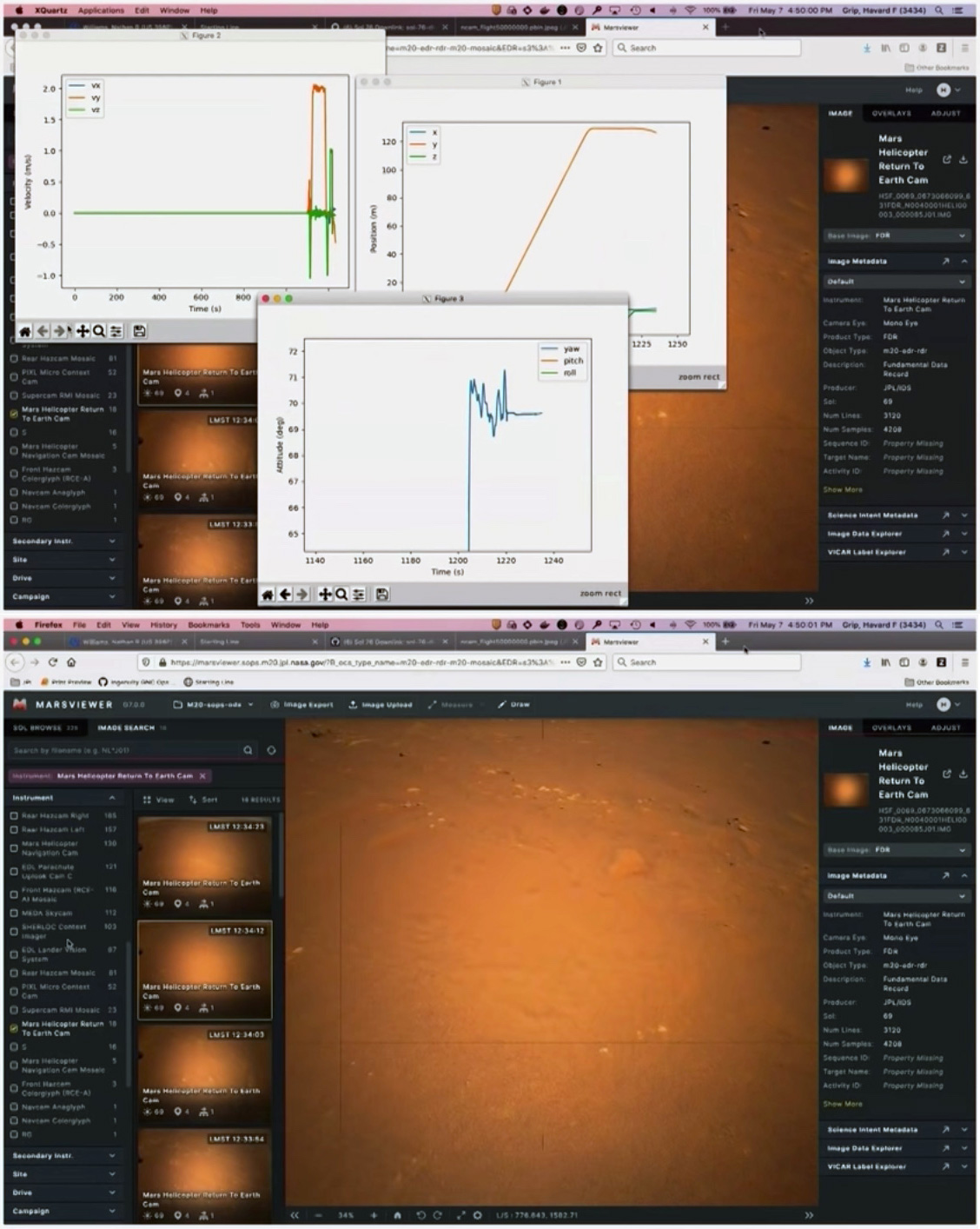 Dati di telemetria (in alto) e immagini aeree del sito di atterraggio (in basso) inviate dall’elicotterino Ingenuity al termine del suo quinto volo di test il 7 maggio 2021. Crediti: Nasa/Jpl