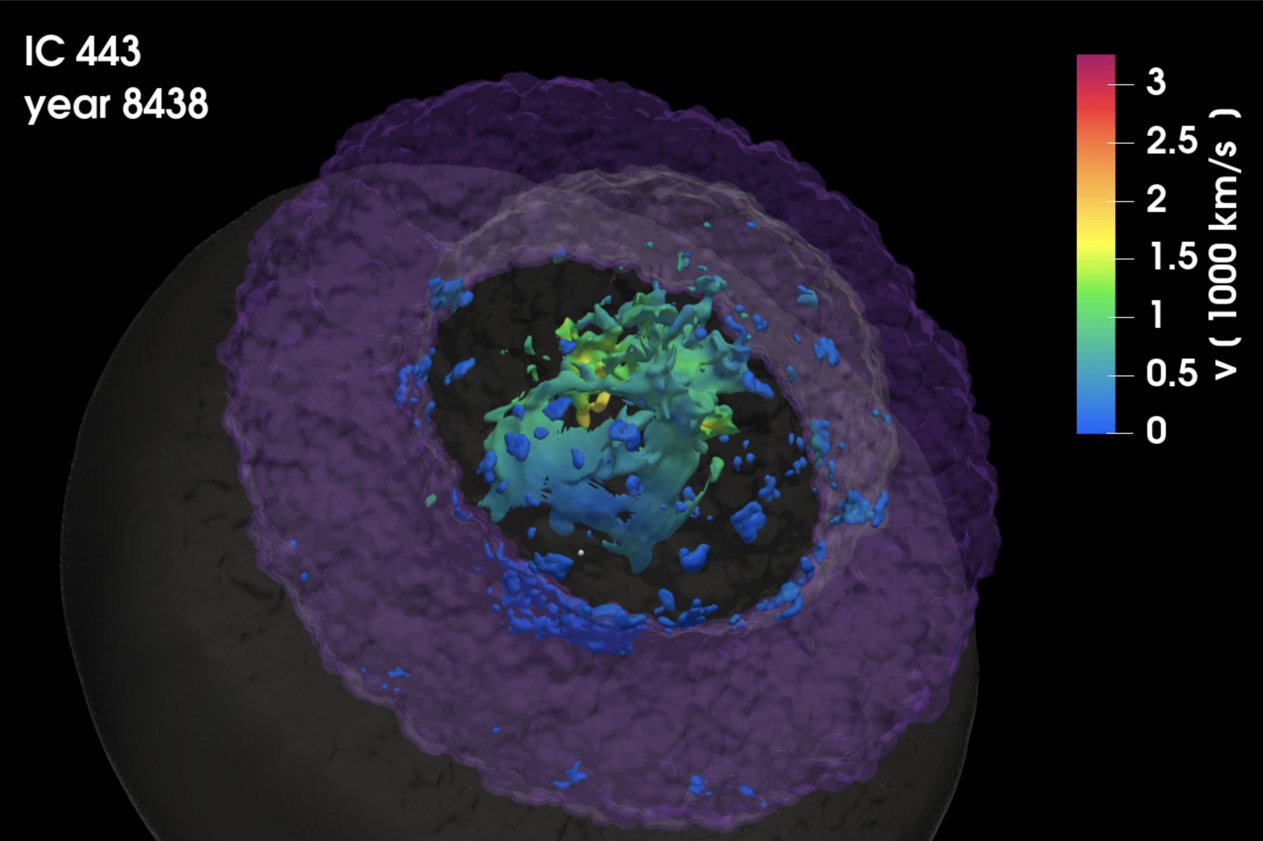 L’immagine (cliccare per ingrandire) mostra la distribuzione di densità di Ic 443 prevista dal modello a 8400 anni dall’esplosione. Il modello è osservato da diverse direzioni: lungo la linea di vista (pannelli a sinistra) e rotato di 90 gradi attorno l’asse z (pannelli a destra). Le superfici opache corrispondono a valori di densità corrispondenti all’1 per cento (pannelli in alto) e 5 per cento (pannelli in basso) del valore di picco. I colori codificano la velocità radiale degli ejecta in unità di 1000 km/s. La superficie semitrasparente mostra la posizione dell’onda d’urto, mentre la struttura toroidale semitrasparente rappresenta la nube molecolare. Crediti: S. Ustamujic, S. Orlando et al., A&A, 2021