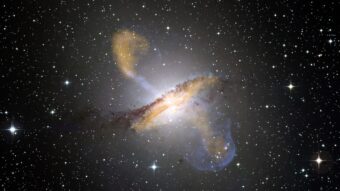 Centaurus A, una galassia con un nucleo attivo che emette getti in rapido movimento nei suoi dintorni. Crediti: Immagine ottica, Eso/Wfi; Immagine submillimetrica, MpIfr/Eso/Apex/A.Weiss et al.; Immagine a raggi X, Nasa/Cxc/Cfa/R.Kraft et al.