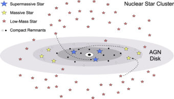 Man mano che diventano più grandi, le stelle nei dischi degli Agn vivono continuamente in bilico fra l’accrescimento di massa dal materiale esterno e la perdita della stessa a causa di potenti venti stellari. Venti che arricchiscono l’ambiente circostante di elementi pesanti come elio, carbonio, azoto e ossigeno prodotti all’interno della stella. Giungerà un momento, come per ogni stella molto massiccia, in cui l’energia derivante dalla fusione non sarà più sufficiente a contrastare il collasso gravitazionale indotto dal proprio stesso peso: la stella esploderà come supernova, arricchendo il mezzo circostante di elementi chimici ancora più pesanti e lasciando, al centro, un resto stellare compatto. Ulteriori processi di accrescimento o fusione potrebbero infine dar luogo a un buco nero.