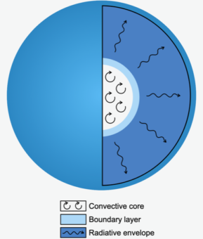 Il mescolamento dovuto ai moti convettivi e alla rotazione stellare rimuove elio dal nucleo e lo rimpiazza con l’idrogeno degli strati esterni. Crediti: May Gade Pedersen.
