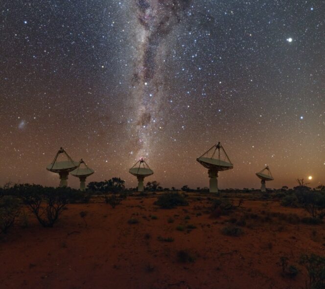 La Via Lattea che si estende sopra il radiotelescopio Askap gestito da Csiro (l’Agenzia scientifica australiana) presso il Murchison Radio-astronomy Observatory in Australia Occidentale. Askap è uno dei precursori del progetto Ska. Crediti: Csiro/A. Cherney