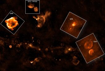 Immagine Askap del campo Scorpio a 912 MHz. Il mosaico copre una regione di circa 40 gradi quadrati. La sagoma dell’equatore galattico è definita da una serie di sorgenti compatte e regioni di idrogeno ionizzato (regioni H II), associate a siti di formazione stellare. Sono inoltre visibili diversi resti di supernova (Snr). Fuori dal piano galattico sono evidenti alcune strutture estese e luminose. Tra queste, la regione in alto al centro del campo comprende le regioni H II G345.45 + 1.50 e IC 4628. I riquadri bianchi sono zoom di alcuni oggetti rappresentativi, in senso orario, un Snr, una regione di formazione stellare con un Massive Young stellar Object, un’altra regione di formazione stellare e una coppia di Snr. Crediti: G. Umana/Inaf
