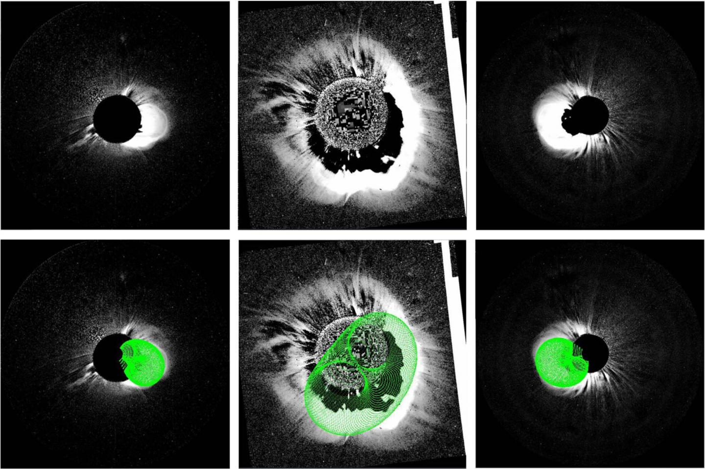 Pannello superiore, da sinistra a destra: espulsione di massa coronale del 12 luglio 2012 osservata rispettivamente nei coronografi STEREO B Cor2, SOHO C2 e STEREO A Cor2. Pannello inferiore: le stesse immagini si sovrappongono ai risultati del modello. Crediti: Talwinder Singh, Mehmet S. Yalim, Nikolai V. Pogorelov, and Nat Gopalswamy