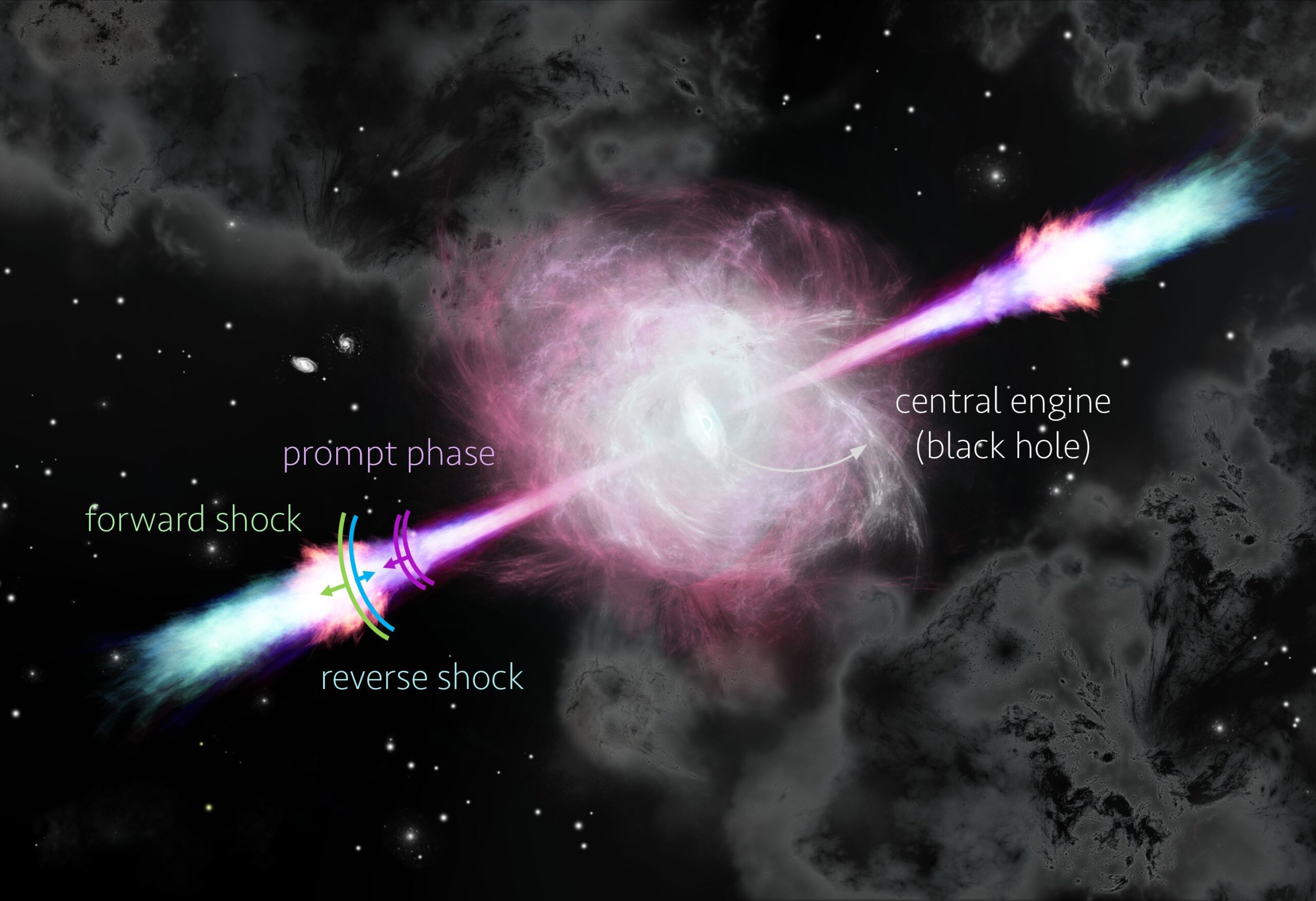 Impressione artistica di un outflow di un Grb che mostra il lampo di raggi gamma, il reverse shock (lo shock che si propaga in direzione della materia espulsa dal Grb) e il forward shock (lo shock che si propaga in direzione del mezzo che circonda il Grb). Crediti: Núria Jordana-Mitjans
