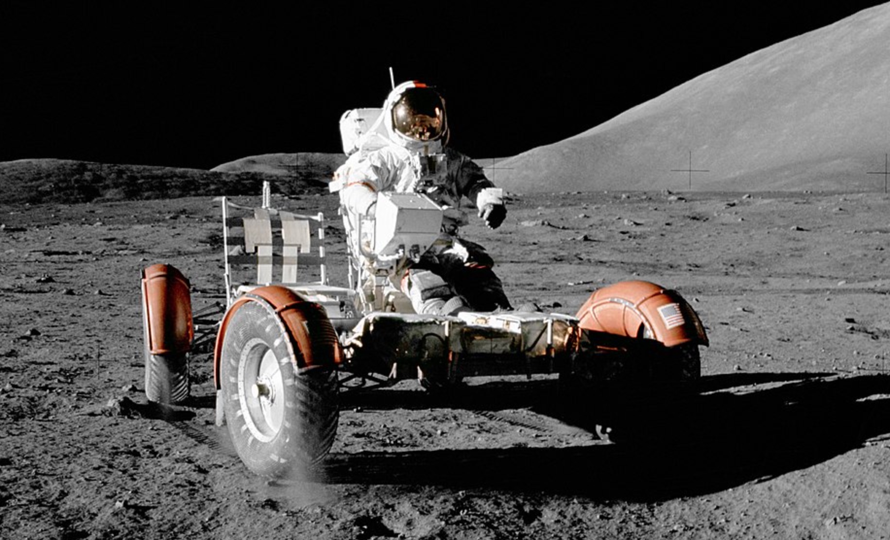 Nel caso di Apollo 16 gli spostamenti si allungarono a 11 chilometri con velocità che toccò punte di 17 km all’ora. Durante la missione Apollo 17 si verificò un curioso incidente. Alla fine della prima uscita, il martello cadde dalla tasca di Eugene Cernan staccando un pezzo di parafango del veicolo lunare. Senza protezione contro la polvere lunare sarebbe stato difficile guidare il rover e Cernan costruì un nuovo parafango unendo con nastro adesivo le sue mappe lunari.