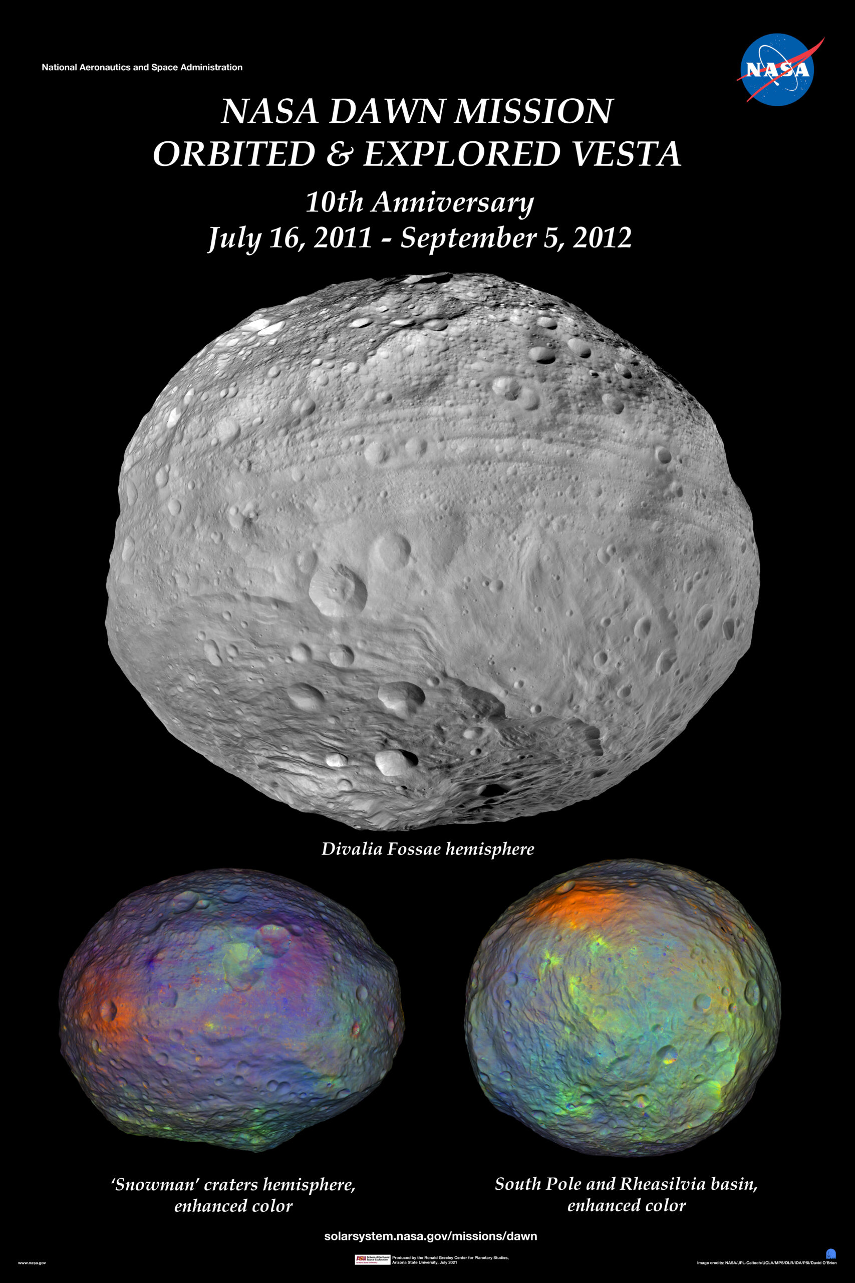 Per celebrare il decimo anniversario dell’arrivo di Dawn a Vesta, la Nasa ha realizzato un poster con un mosaico di immagini dell’asteroide ottenute dalla fotocamera a bordo della sonda. Il mosaico centrale in bianco e nero, realizzato a partire da molte immagini più piccole, mostra una regione in prossimità dell’equatore di Vesta, dove è visibile un vasto sistema di depressioni, denominato Divalia Fossae, che supera le dimensioni del Grand Canyon e ricopre la superficie dell’asteroide per 465 km di lunghezza e 22 km di larghezza. L’immagine mostra anche la forma irregolare, non sferica, di Vesta. All’origine di ciò vi sarebbero due grandi impatti, il più grande dei quali, avrebbe prodotto il cratere Rheasilva, visibile nell’immagine a colori in basso a destra, e sarebbe anche all’origine del sistema di creste e depressioni all’equatore, formatosi oltre un miliardo di anni fa.