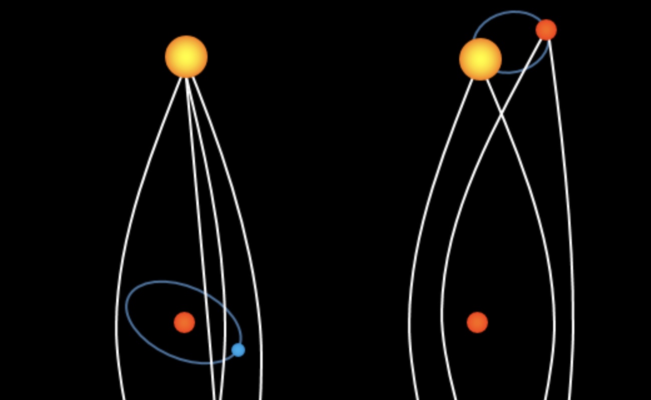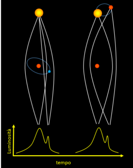 Illustrazione del microlensing di una sorgente singola da parte di una lente che ospita un sistema planetario (a sinistra) e una sorgente binaria da una lente singola (a destra). In basso le curve di luce, che possono essere nei due casi molto simili. Crediti: