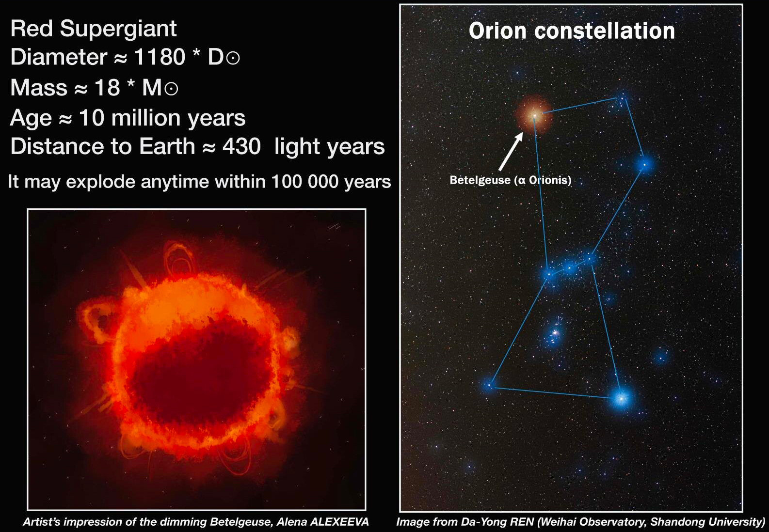 Tra la fine del 2019 e l’inizio del 2020, Betelgeuse (α Orionis) è diventata più debole di oltre 2,5 volte: l’attenuazione più significativa osservata negli ultimi decenni. Crediti: Alena Alexeeva and Ren Dayong