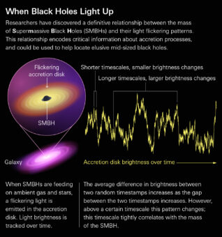 Lo studio della variazione di luminosità di 67 galassie attive ha rivelato una correlazione tra la massa dei buchi neri supermassicci che si alimentano attivamente e la caratteristica scala temporale delle fluttuazioni di luce. I dischi di accrescimento, infatti, durante il processo di alimentazione del buco nero, mostrano fluttuazioni casuali di luminosità per ragioni ancora non comprese, causando una variabilità della radiazione su diverse scale temporali.
