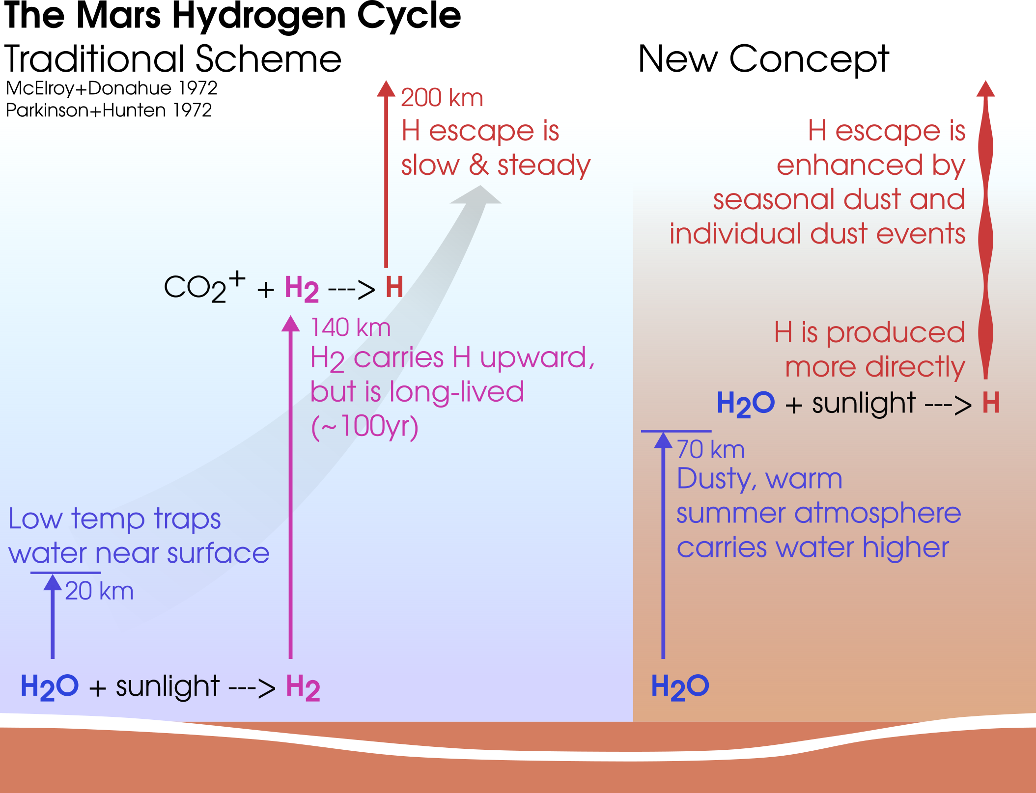 Modello tradizionale (a sinistra) e nuovo (a destra) della fuga di idrogeno da Marte (cliccare per ingrandire). Crediti: Chaffin et al. 2021