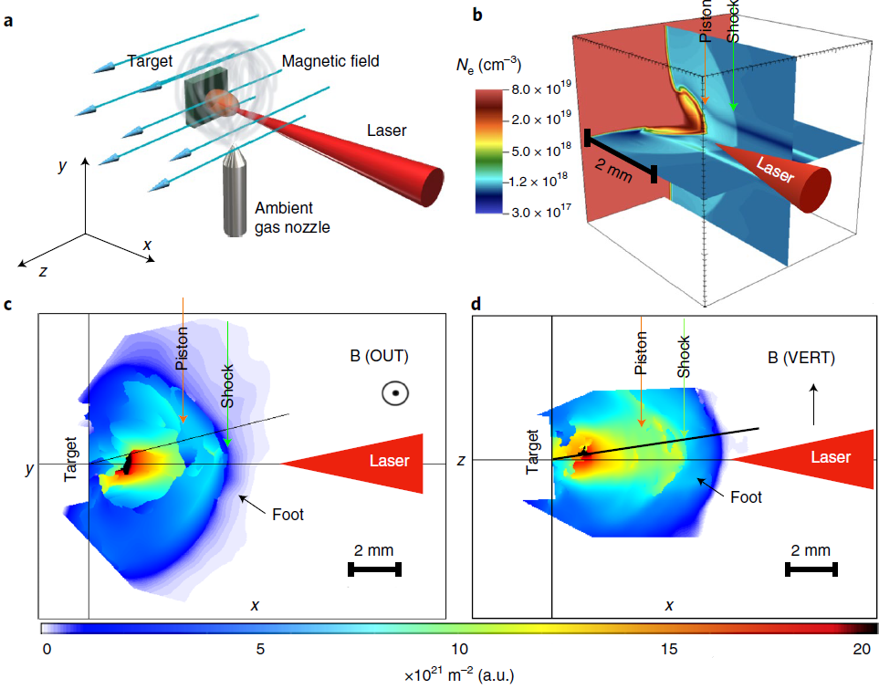 La figura mostra il setup dell’esperimento. Nel pannello a) si può vedere il gas ambiente, il target solido, la direzione del laser e quella del campo magnetico. Il pannello b) mostra anche un rendering tridimensionale del plasma in espansione nel gas ambiente ottenuto da simulazioni Flash. I pannelli c) e d) mostrano la densità del gas (integrata lungo la linea di vista) 4 ns dopo l’incidenza del laser, misurata in due diversi piani (x-y e x-z). La direzione del campo magnetico è anche indicata. Crediti: W. Yao et al., Nature Physics, 2021