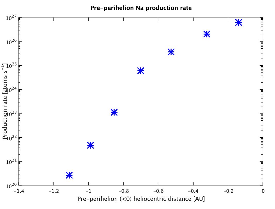 Il tasso di produzione totale di sodio calcolato per Phaethon in funzione della distanza eliocentrica entro circa un’unità astronomica dal Sole (45 giorni prima del perielio). Crediti: Joseph R. Masiero et al. 2021 Planet. Sci. J. 2 165