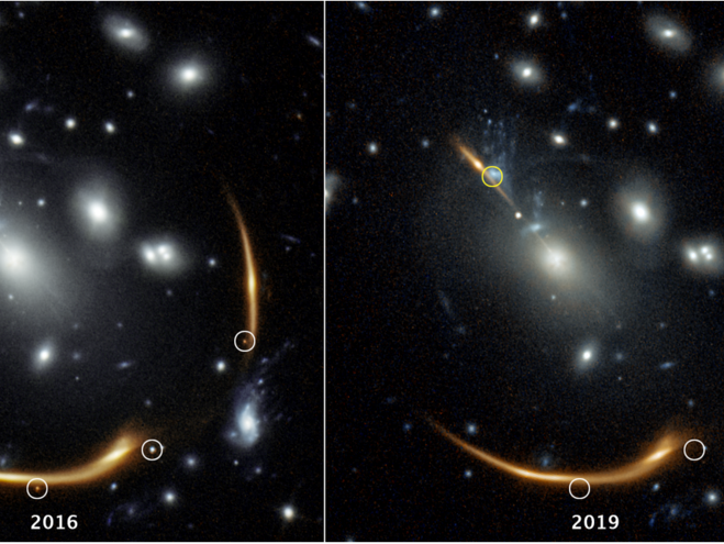 Tre visioni della stessa supernova appaiono nell’immagine del 2016 (a sinistra), scattata dal telescopio spaziale Hubble, che risultano sparite nell’immagine di destra, del 2019. La lontana supernova, chiamata Requiem, fa parte del gigantesco ammasso di galassie Macs J0138. L’ammasso è così massiccio che la sua potente gravità piega e ingrandisce la luce della supernova, situata in una galassia che si trova molto più indietro. Questo fenomeno, che prende il nome di lente gravitazionale, divide la luce della supernova in più immagini speculari, evidenziate dai cerchi bianchi nell’immagine del 2016. Considerando che le supernove svaniscono nel tempo, l’istantanea scattata nel 2019 ha aiutato gli astronomi a confermare la natura dell’oggetto. I ricercatori prevedono che una replica della stessa supernova farà la sua comparsa più o meno nel 2037, nella presunta posizione evidenziata dal cerchio giallo in alto a sinistra. Crediti: Joseph DePasquale (Stscl)
