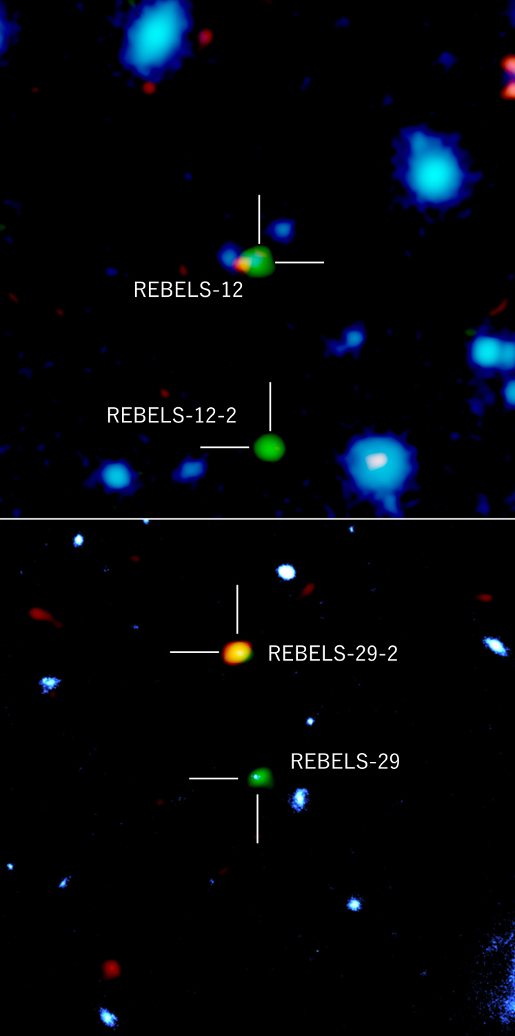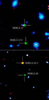 Nel loro articolo pubblicato oggi su Nature la sorprendente rivelazione: le emissioni inspiegabili appartengono a due galassie precedentemente sconosciute, non visibili nelle lunghezze d’onda dell’ultravioletto in quanto completamente oscurate dalla polvere cosmica. Denominate Rebels-12-2 e Rebels-29-2, le due galassie si sono formate più di 13 miliardi di anni fa e presentano caratteristiche simili a quelle di altre della stessa epoca, se si esclude la massiccia oscurazione dovuta alla polvere che esse stesse hanno prodotto, un effetto che tipicamente si osserva solo per oggetti astronomici molto più evoluti. Lo studio rivela come la presenza di questi due oggetti potrebbe essere solo la punta dell’iceberg dell’esistenza di una popolazione di galassie precedentemente sconosciuta agli astronomi.