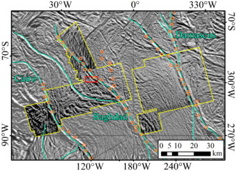 La regione delle tiger stripes (indicate in turchese). I riquadri in giallo indicano le zone di cui sono disponibili immagini ad alta risoluzione; i cerchi arancioni indicano la posizione delle “bocche” dei geyser; il riquadro rosso indica la regione mostrata in dettaglio nell’ultima figura in questo articolo (cliccare per ingrandire). Crediti: Pajola et al. 2021