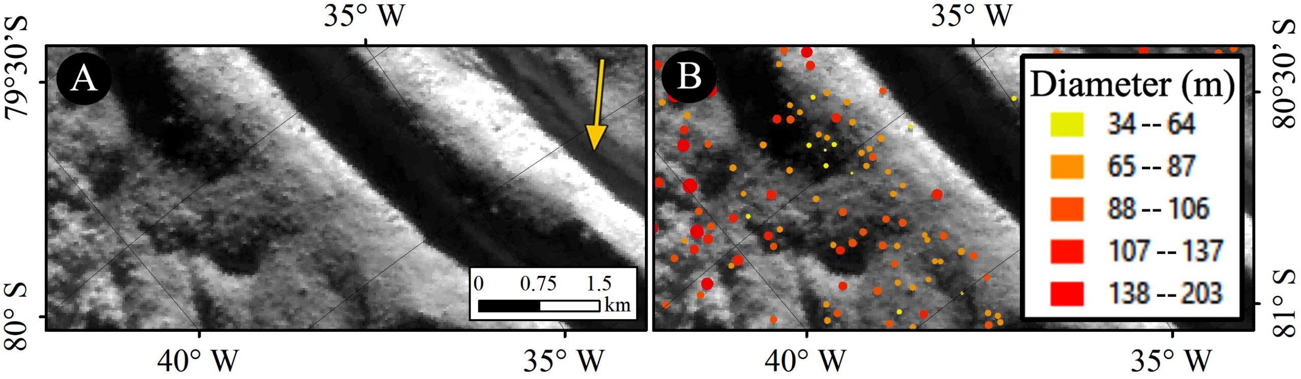 A sinistra, una porzione dell’immagine raccolta dalla Narrow Angle Camera del Cassini Imaging Science Subsystem (indicata con un riquadro rosso nella seconda figura in questo articolo). La freccia gialla indica la direzione della luce solare. A destra, la stessa immagine con la posizione dei massi identificati. Il colore indica le dimensioni crescenti: giallo e arancione per i massi più piccoli, rosso per quelli più grandi (cliccare per ingrandire). Crediti: Pajola et al. 2021