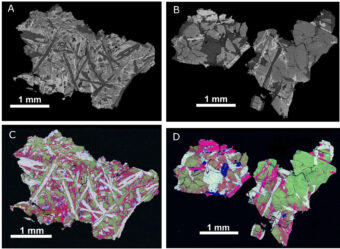 Immagini al microscopio elettronico ottenute con la tecnica Back-scattered electrons (riquadri A e B) e mappa degli elementi chimici attenuta con la Energy Dispersive Spectroscopy (riquadri C e D) dei due frammenti lunari CE-5-B1 (A e D) e CE-5-B2 (B e D). In C e D, il blu indica il silicio, il verde il magnesio, il rosso il ferro, il bianco l’alluminio, il giallo il calcio, il rosa il titanio e il ciano il potassio. Crediti: Xiaochao Che et al. Science, 2021