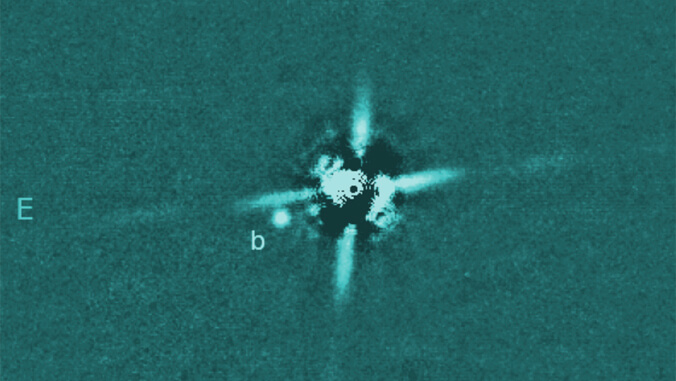 Immagine diretta del pianeta (indicato dalla lettera ‘b’), che si trova a una distanza dalla sua stella madre pari a circa 100 volte quella fra la Terra e il Sole. Crediti: University of Hawaii