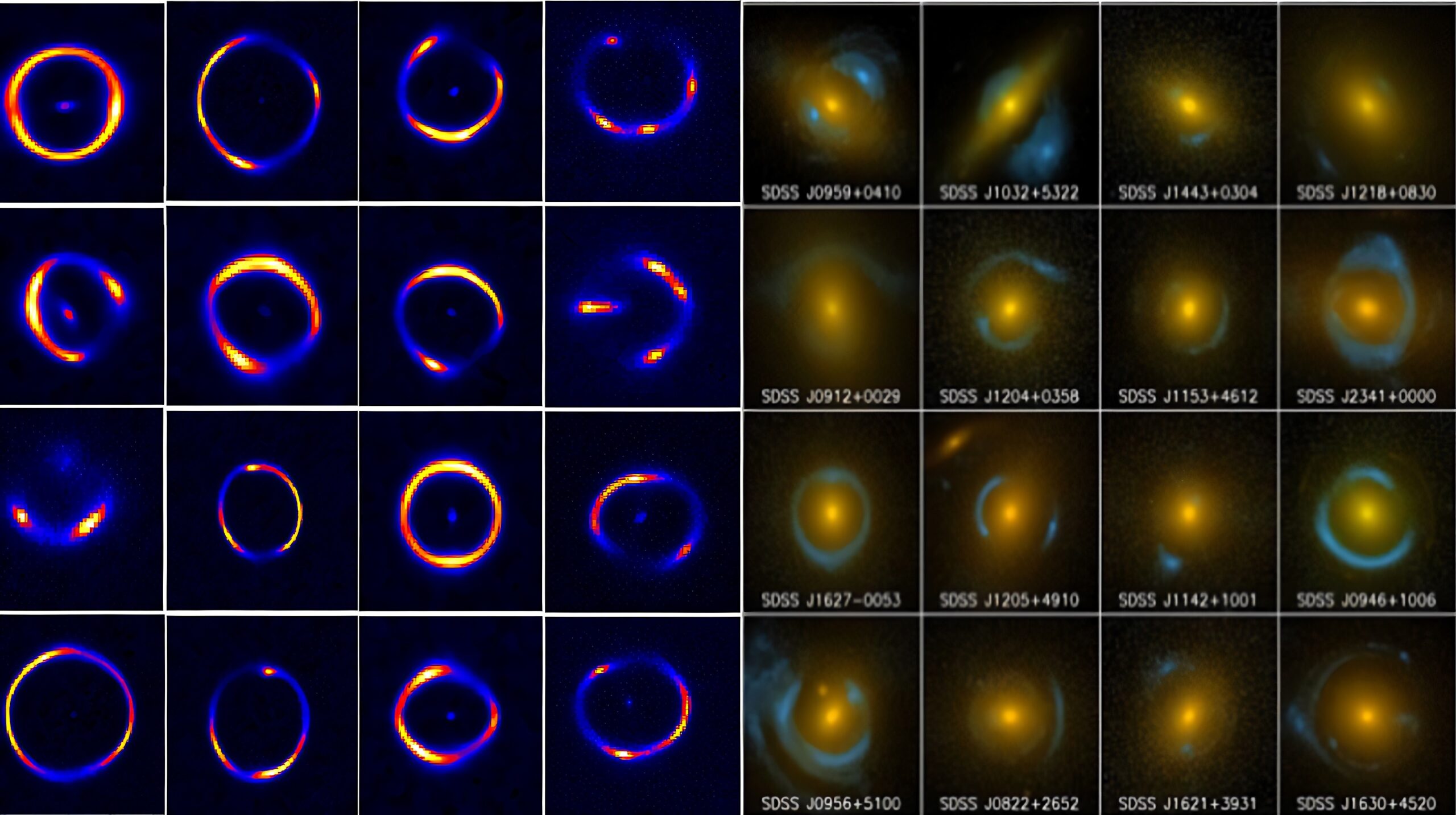 Mosaico di lenti gravitazionali in falsi colori. In alto vengono mostrate delle lenti gravitazionali simulate. Il fenomeno del lensing gravitazionale trasforma l’immagine di una galassia lontana in archi e anelli, e viene simulato utilizzando come lenti delle galassie all’interno delle simulazioni Eagle. La galassia lente posta al centro è stata rimossa in queste immagini. Nella parte in basso, invece, possiamo vedere degli esempi reali di lenti gravitazionali, osservati con il telescopio spaziale Hubble e analizzati all’interno della collaborazione Slacs. In ogni pannello, la galassia lente è mostrata in arancione, mentre l’immagine della sorgente, trasformata in archi e anelli, è colorata di blu. Gli archi simulati sono fortemente realistici, rappresentano dei fac-simile di lenti reali: questo ha permesso ai ricercatori di questo studio di investigare i processi che si celano dietro l’evoluzione delle galassie lenti. Crediti: S. Mukherjee/Hubble Space Telescope
