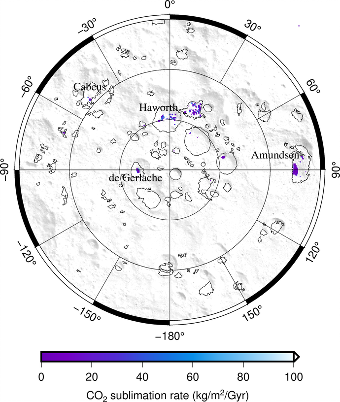 Nelle regioni permanentemente in ombra ai poli della Luna, le temperature scendono al di sotto di quelle nelle aree più fredde di Plutone, rendendo possibile l’esistenza di trappole fredde di anidride carbonica. In queste zone, le molecole di anidride carbonica potrebbero congelare e rimanere in forma solida anche durante i picchi più alti di temperatura dell’estate lunare.
