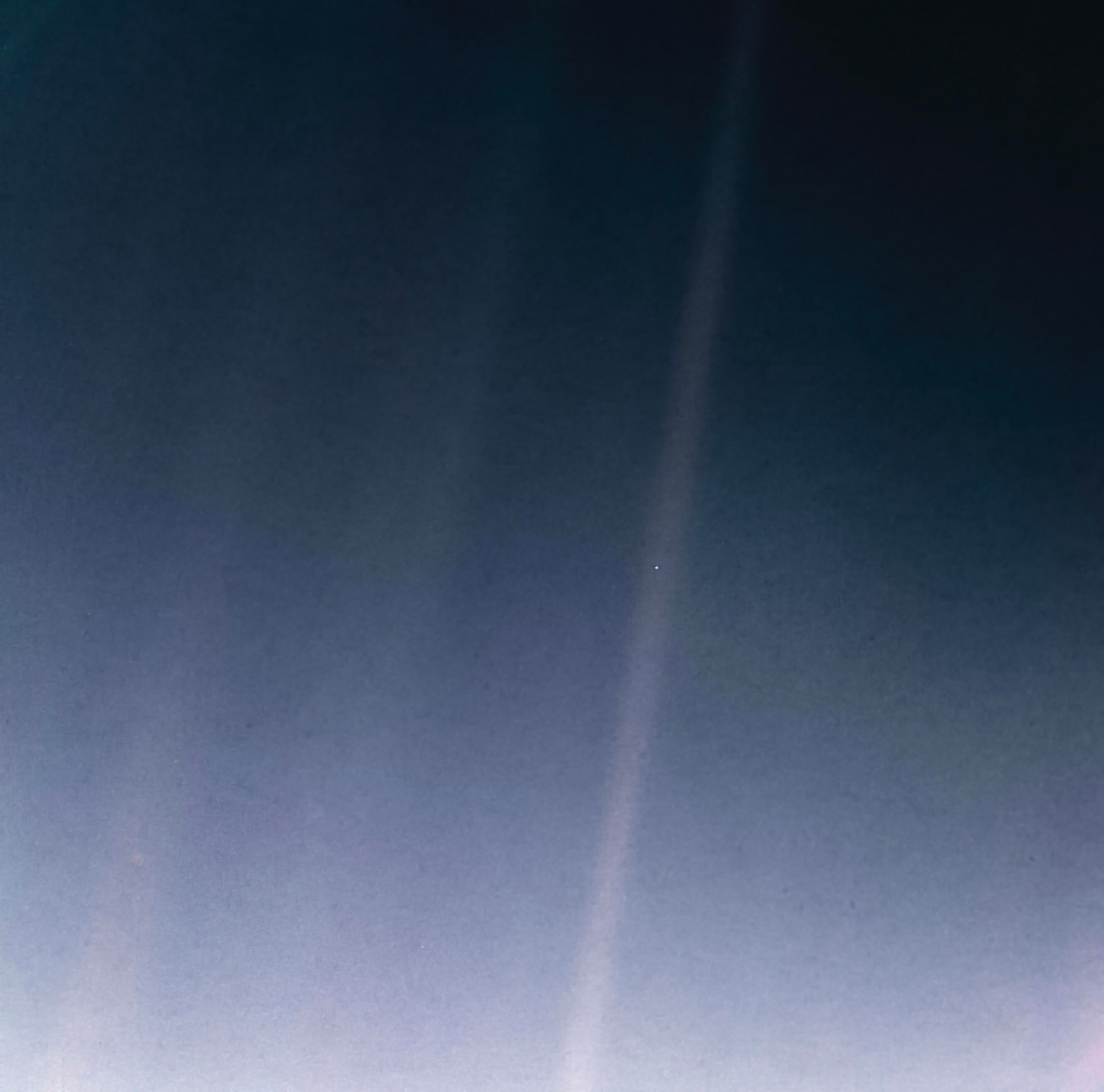 La scelta di parlare di spazio parlando della Terra – “la nostra casa” – si concretizza con la lettura di un brano – quello di Sagan, appunto – nato dalla suggestione di un’immagine della Terra vista dalla sonda Voyager 1 nel 1990, dalla distanza di sei miliardi milioni di chilometri da noi, oltre l’orbita di Nettuno. La celeberrima immagine passata alla storia come Pale blue dot – il pallido puntino blu – è stata votata nel 2001 come una delle dieci migliori immagini scientifiche dello spazio di tutti i tempi.