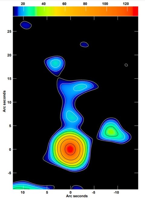 Mappa radio in falsi colori, ricavata tramite Jvla, del getto relativistico e di una traccia di un lobo radio esteso della più distante delle due sorgenti, ovvero Sdss J0100+2802. La regione compatta e dall’emissione più intensa (colorata dal giallo-verde al rosso) corrisponde alla parte più vicina al nucleo, ovvero il getto relativistico. Con Jvla non si riesce a risolvere la forma e la struttura del getto, perciò saranno necessarie altre osservazioni più profonde e con una migliore risoluzione. Le regioni azzurre-blu poste sopra alla regione nucleare sono emissioni più deboli provenienti da una grande struttura che va a formarsi quando il getto frena contro il mezzo intergalattico, ovvero il lobo. Crediti: T. Sbarrato et al./Inaf/ A&A 2021