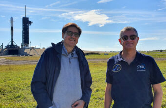 Da sinistra: Paolo Soffitta, ricercatore Inaf e responsabile scientifico italiano della missione Ixpe, e Giorgio Saccoccia, presidente Asi, al Kennedy Space Center, in Florida. Alle loro spalle, il Falcon 9 di SpaceX pronto a portare Ixpe in orbita. Crediti: Stefano Parisini/Media Inaf