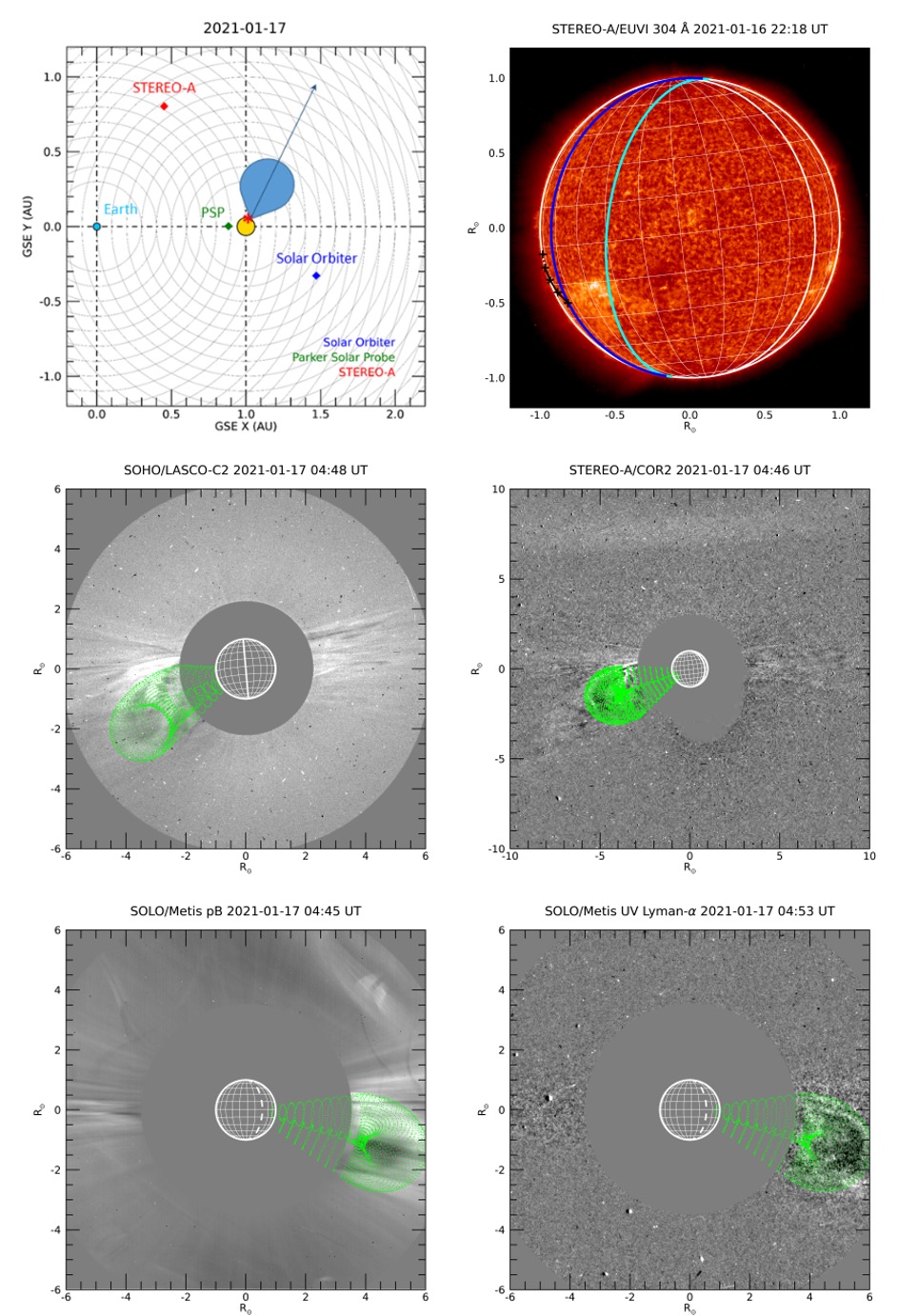 In alto a sinistra: posizione delle varie sonde e nel sistema solare al momento dell’eruzione di massa coronale (Cme) osservata nel gennaio 2021. La freccia indica la direzione di propagazione della Cme. In alto a destra: immagine del disco solare visto dalla sonda Stereo-A con lo strumento Secchi-Euvi, e con l’indicazione della regione di origine della Cme e dei lembi del disco solare visto dalle altre sonde (Solar Orbiter e Soho). I restanti quattro pannelli mostrano la Cme vista da Soho/Lasco-C2, Stereo-A/Secchi-Cor2, e da Solar Obiter/Metis, con i sue due canali in luce visibile (“pB”) e ultravioletta (“Uv Lyman-α”). In verde è mostrato un modello teorico tridimensionale della struttura della Cme. Crediti: Andretta et al., A&A 2021