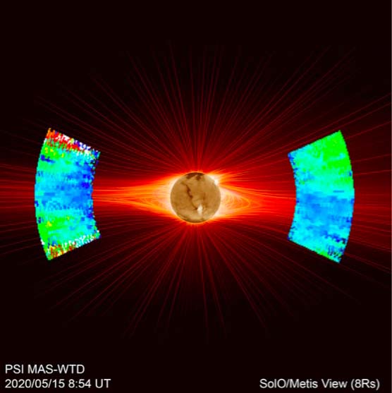 Prima mappa della velocità del vento solare ottenuta dalle brevi immagini di “prima luce” di Metis. La mappa mostra la prima derivazione della velocità di espansione dell’idrogeno in regioni equatoriali molto distanti dal Sole sovrapposta ad una estrapolazione dell’aspetto della corona solare e del suo campo magnetico nel giorno dell’osservazione. Crediti: Romoli et al., A&A 2021