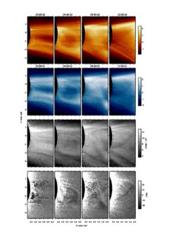 Evoluzione della CME osservata nel gennaio 2021 da METIS, nel canale visibile (prima riga) e ultravioletto (seconda riga). Il rapporto tra le due immagini è mostrato nella terza riga, mentre la quarta riga mostra come la velocità di evoluzione della CME vista nell’ultravioletto. Crediti: Andretta et al., A&A 2021