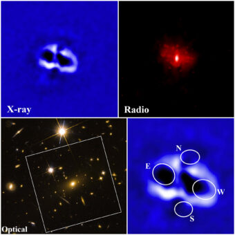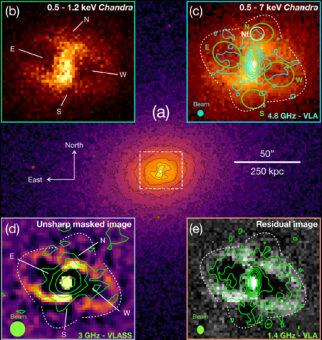 Una possibile spiegazione di questo fenomeno, fino a oggi mai osservato, è la presenza all’interno dell’ammasso di galassie di due buchi neri supermassicci che, quasi in contemporanea, hanno espulso getti di materia in direzioni tra loro perpendicolari.
